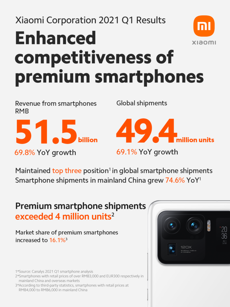 U prvom kvartalu 2021. godine, poslovanje kompanije Xiaomi u segmentu pametnih telefona nastavilo je da značajno raste. Prihod od prodaje pametnih telefona porastao je za 69,8% na 51,5 milijardi RMB u odnosu na prošlu godinu. Globalne isporuke pametnih telefona u tom periodu dostigle su 49,4 miliona jedinica, a bruto profitna marža za poslovanje sa pametnim telefonima iznosila je 12,9%. Prema Canalis-u, Grupa je tokom kvartala zadržala 3. poziciju u pogledu globalne isporuke pametnih telefona, držeći tržišni udeo od 14,1%.