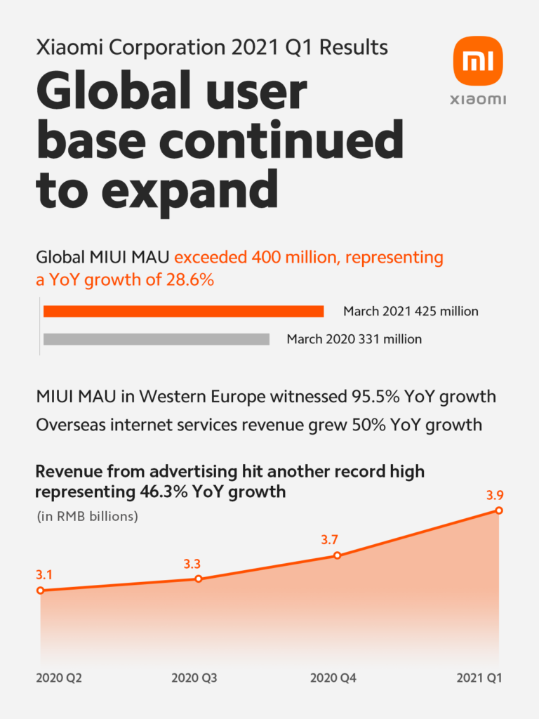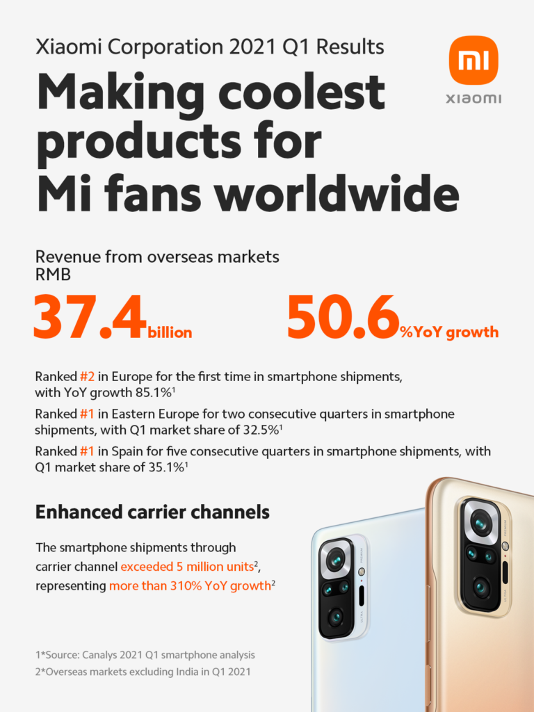 Globalna tržišta održavaju zamah rasta, dok se u Evropi beleži eksplozivan rast. U prvom kvartalu 2021. godine, prihod kompanije Xiaomi sa globalnih (overseas markets) tržišta porastao je za 50,6% u odnosu na prošlu godinu, na 37,4 milijarde RMB. Prema Canalis-u, tržišni udeo kompanije Xiaomi u prvom tromesečju svrstao se među pet najboljih kompanija koje se bave pametnim telefonima u pogledu isporuka u 62 zemlje i regiona širom sveta, i broj jedan u 12 zemalja i regiona.