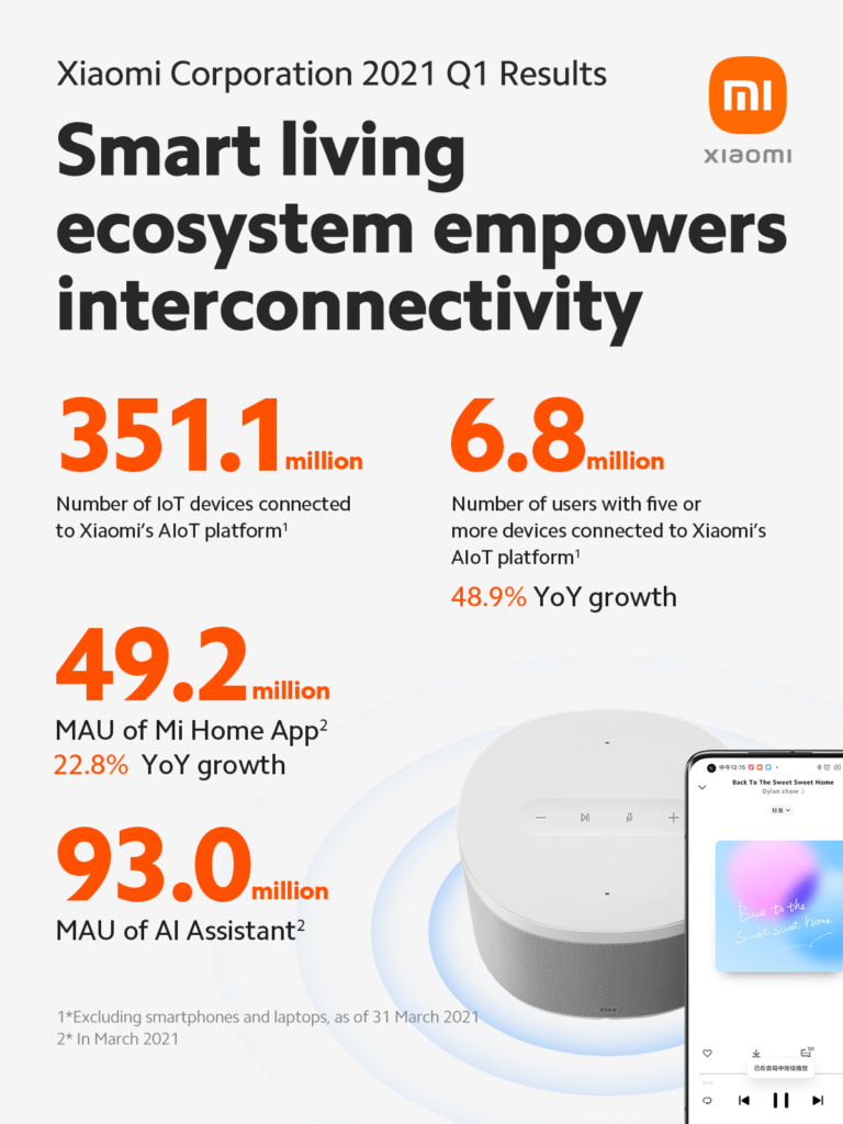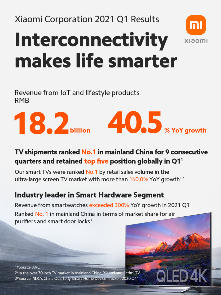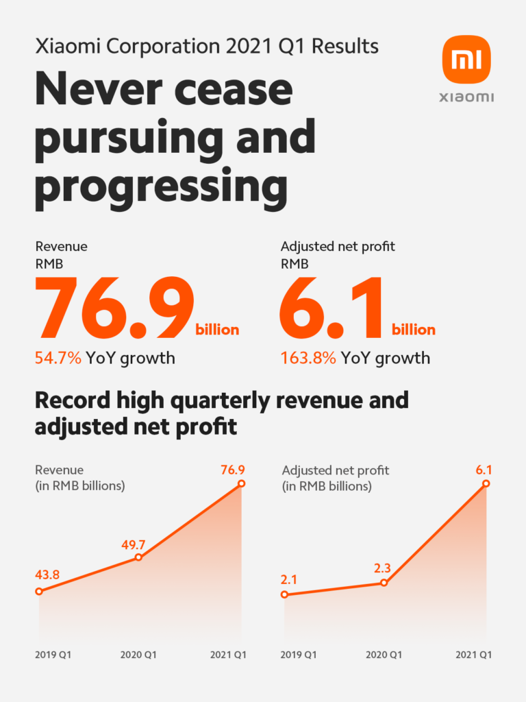Beograd, Srbija, 27. maj – Kompanija Xiaomi, globalni tehnološki lider, objavila je svoje nerevidirane konsolidovane rezultate za tri meseca koja su se završila 31. marta 2021. godine. U prvom kvartalu 2021. godine, ukupan prihod i prilagođeni neto profit kompanije Xiaomi daleko je premašio očekivanja tržišta. Ukupan prihod za pomenuti period iznosio je 76,9 milijardi RMB, što predstavlja povećanje od 54,7% u odnosu na prethodnu godinu, dok je korigovana neto dobit za isti period iznosila 6,1 milijarde RMB, što je porast od 163,8% u odnosu na prošlu godinu.